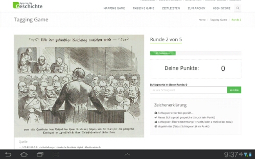 Das Tagging Game der GeschichtsApp lässt sich zum Lernen einsetzen. Dabei können die „SpielerInnen“ auch Punkte für die Highscore sammeln, zugleich wiederholen sie aber zentrale Inhalte des Unterrichts und üben die Einordnung von Bildquellen. Dazu stellt die Lehrkraft aus dem Archiv der App geeignete Bildquellen, wie z.B. Karikaturen, für die jeweilige Lerngruppe zusammen und lädt ggf. weitere Bilder hoch, um sie als Sammlung zur Verfügung zu stellen. Während die Bilder im Archiv mit Metadaten wie Veröffentlichungsjahr, Autor, Kurzbeschreibung