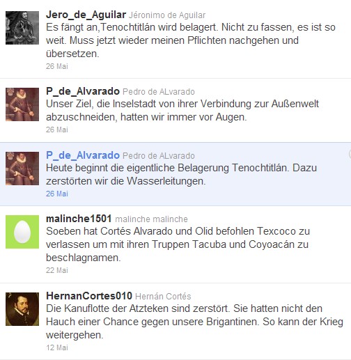 Twitter diente bei beiden Projekten zur Darstellung von Geschichte. Dabei bedingt Twitter als Medium eigene Darstellungsbedingungen – wie andere Formen wie z.B. Film, Dialog im Heft schreiben, Essay, Plakat übrigens auch. Diese Bedingungen des Mediums gilt es zu reflektieren und eine medienadäquate eigene Darstellung zu produzieren. Dies gilt grundsätzlich. Twitter bietet eine mögliche Alternative eine historische Narration zu erstellen, die besonders geeignet scheint für personalisierte Zugänge zur Geschichte sowie um Interaktionen historischer Personen deutlich zu machen. Dies lässt sich z.B. auf einem Plakat in dieser Weise nicht so gut abbilden.