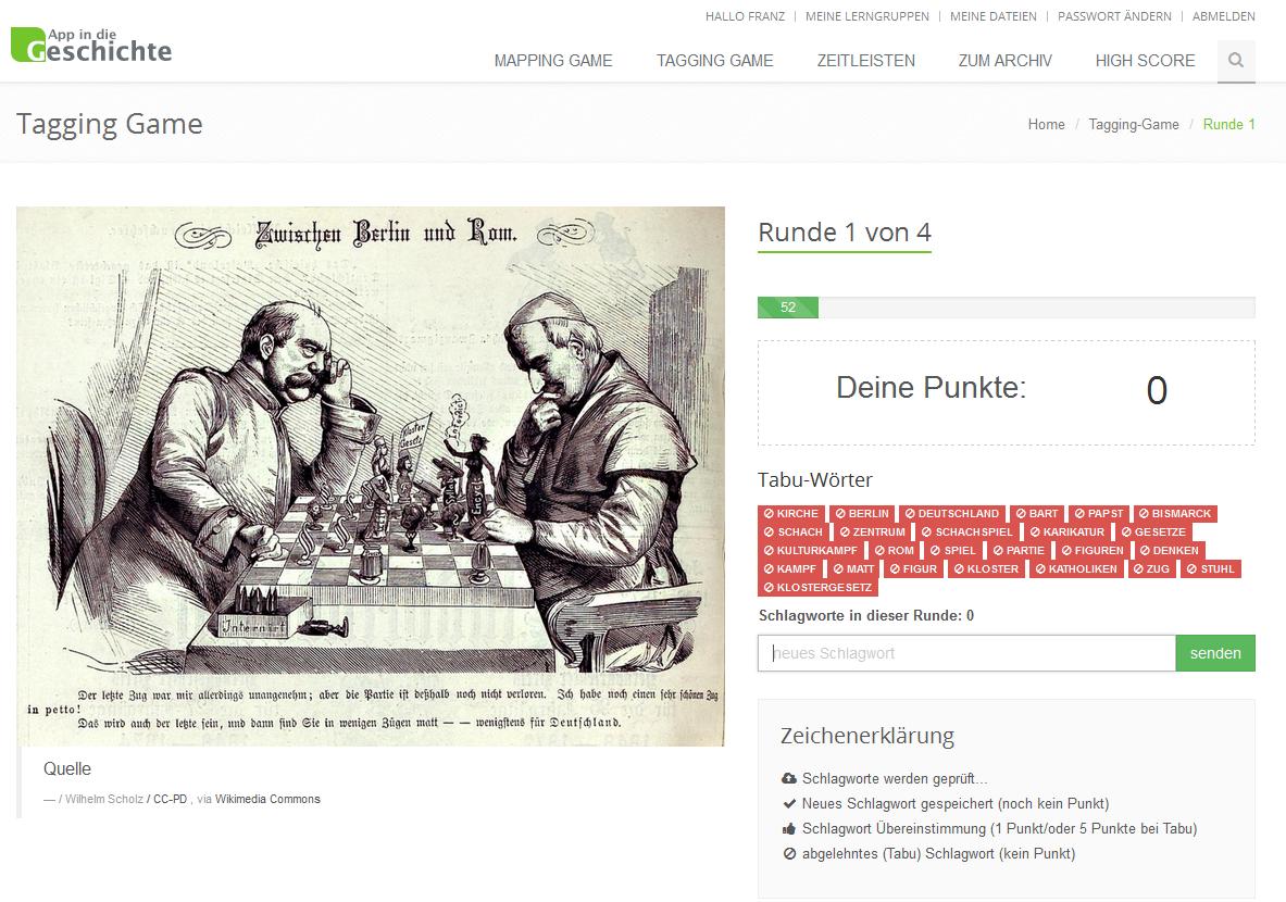 Sobald einer Quelle fünf als „richtig erkannte“ Schlagworte zugeordnet sind, erscheint sie nur noch im Tabu-Spiel, wo sie weiter verschlagwortet wird. Nun werden die bereits existierenden Schlagworte angezeigt und dürfen nicht mehr eingegeben werden. Auch hier gibt es für weitere richtige Schlagworte Highscore-Punkte. Die vergebenenen Schlagworte werden den Quellen dauerhaft zugeordnet und sind fortan auch über die Suchfunktion im App-Archiv nutzbar. Da die Schlagworte von allen Nutzern vergeben werden, können sich auch Fehler einschleichen, z.B. weil ausprobiert wird, ob auch „Schlumpf“ als Schlagwort akzeptiert wird, Symbole nicht richtig gedeutet werden oder die Fachbegriffe fehlen und so z.B. bei Bildern aus dem Zweiten Weltkrieg das Schlagwort „Bundeswehr“ eingegeben wird.