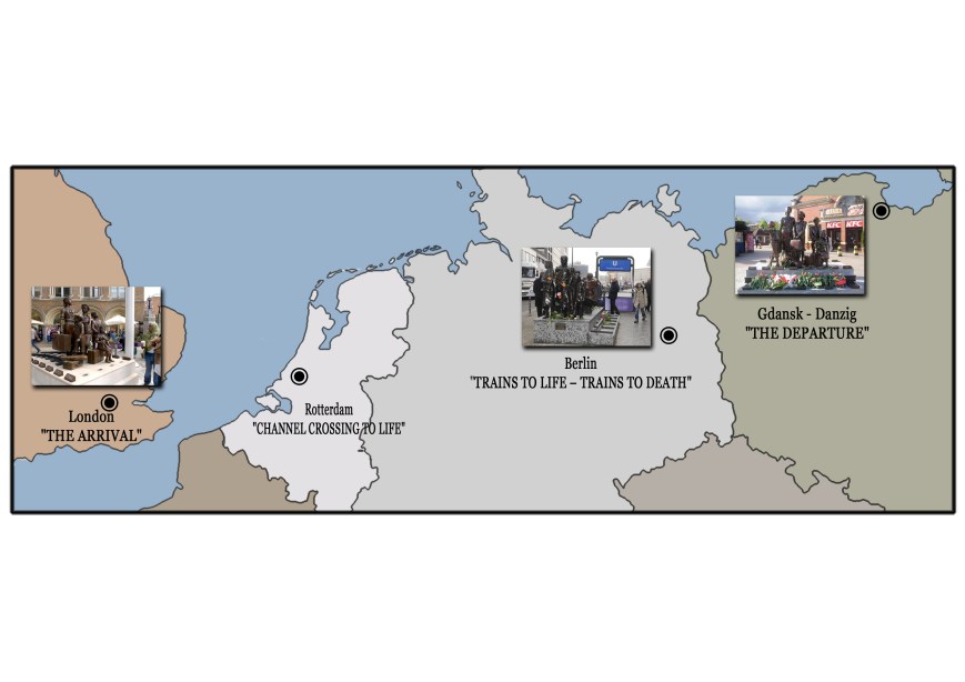 Am Beginn stand für mich eine zufällige Beobachtung bei Reisen nach London und Danzig. Frau Schäfer, Pressesprecherin der Initiative „Berliner Kinderskulptur“ war so freundlich mir auf den Blogeintrag hin, auf die europäische Dimension der Aktion hinzuweisen, die auch auf der folgenden Karte deutlich wird. Weitere Skulpturen sind an Standorten in Rotterdam und Hamburg geplant: